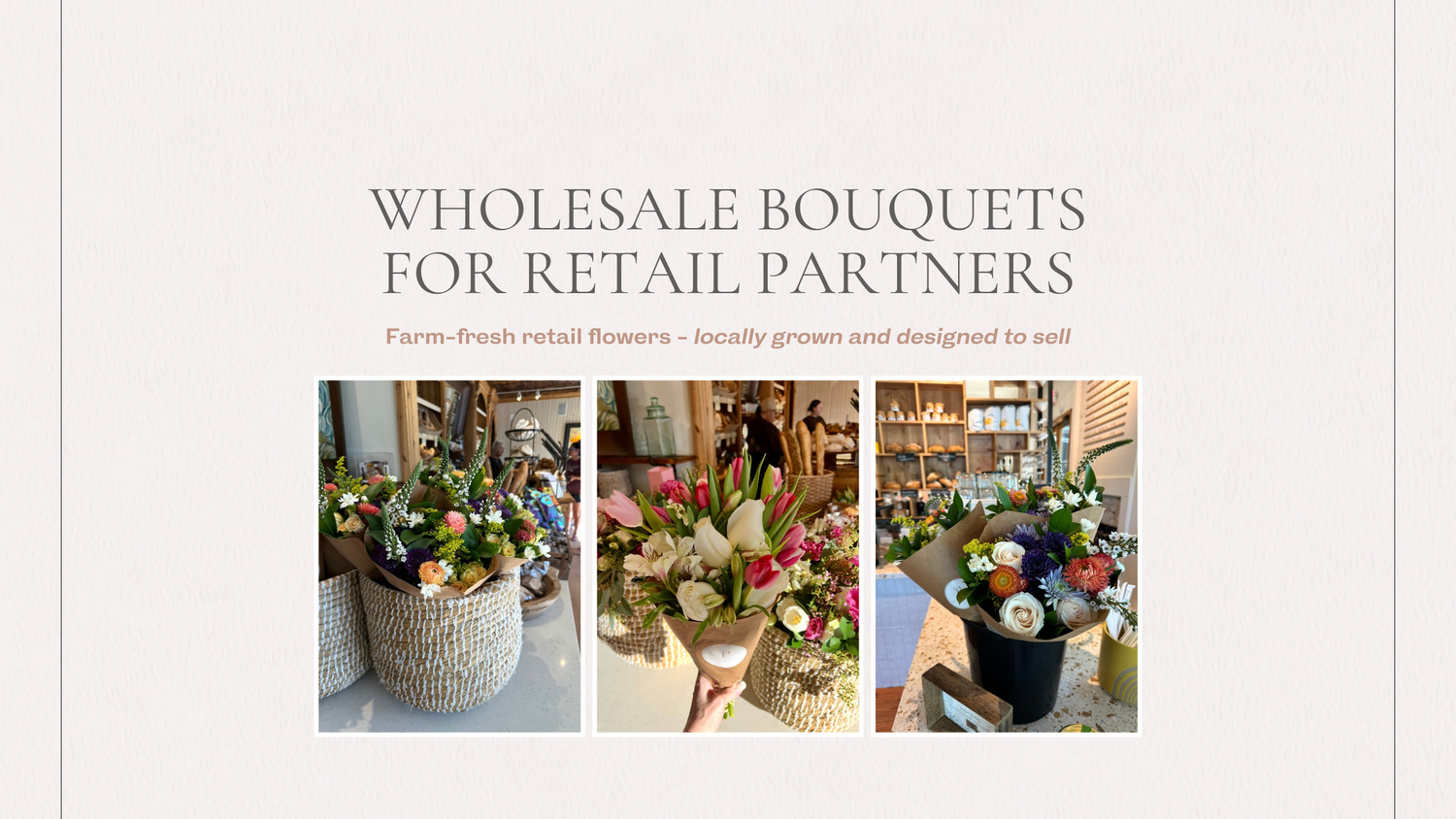 Our wholesale bouquets are thoughtfully designed to be retail-ready, seasonal, and easy to sell. Each bouquet is created with a mix of locally grown focal flowers, supporting blooms, and natural texture, arranged to feel lush, balanced, and gift-worthy.