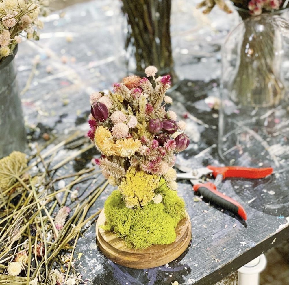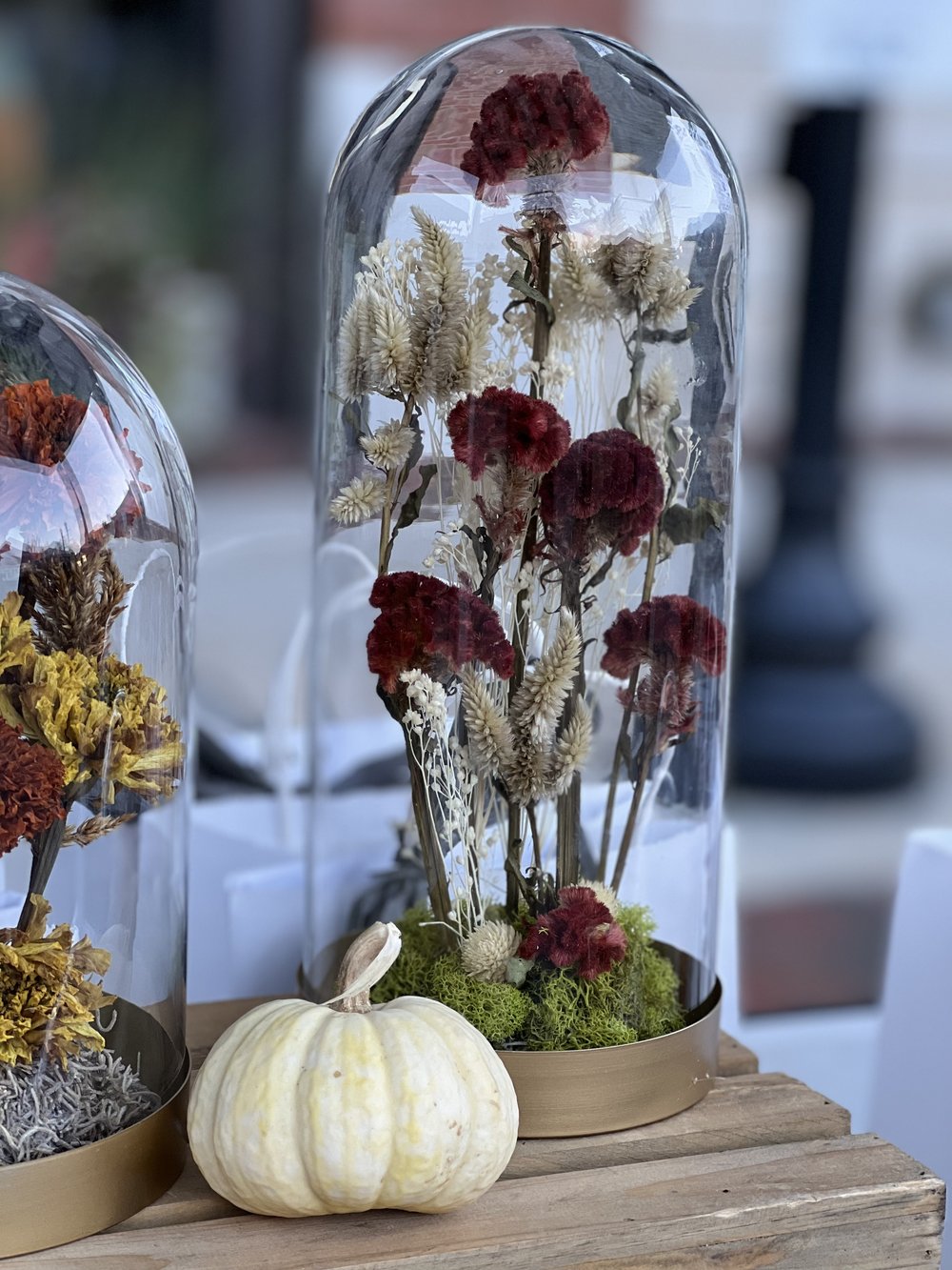 Learn the art of dried flower arranging. You’ll choose from a beautiful selection of dried flowers to arrange in a 10-inch glass cloche with a brass base. You can even bring your own dried flowers if you have some from your wedding or another special occasion.